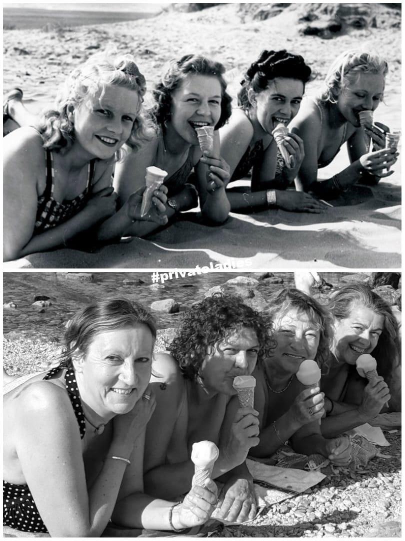 We are six friends based in North East England and London, who holiday together every year in September. We love doing these re-enactment photos and never prepare beforehand! We source the images when we arrive at our destination, then start the prop and location hunt, usually spending a day or two on the actual shoot.